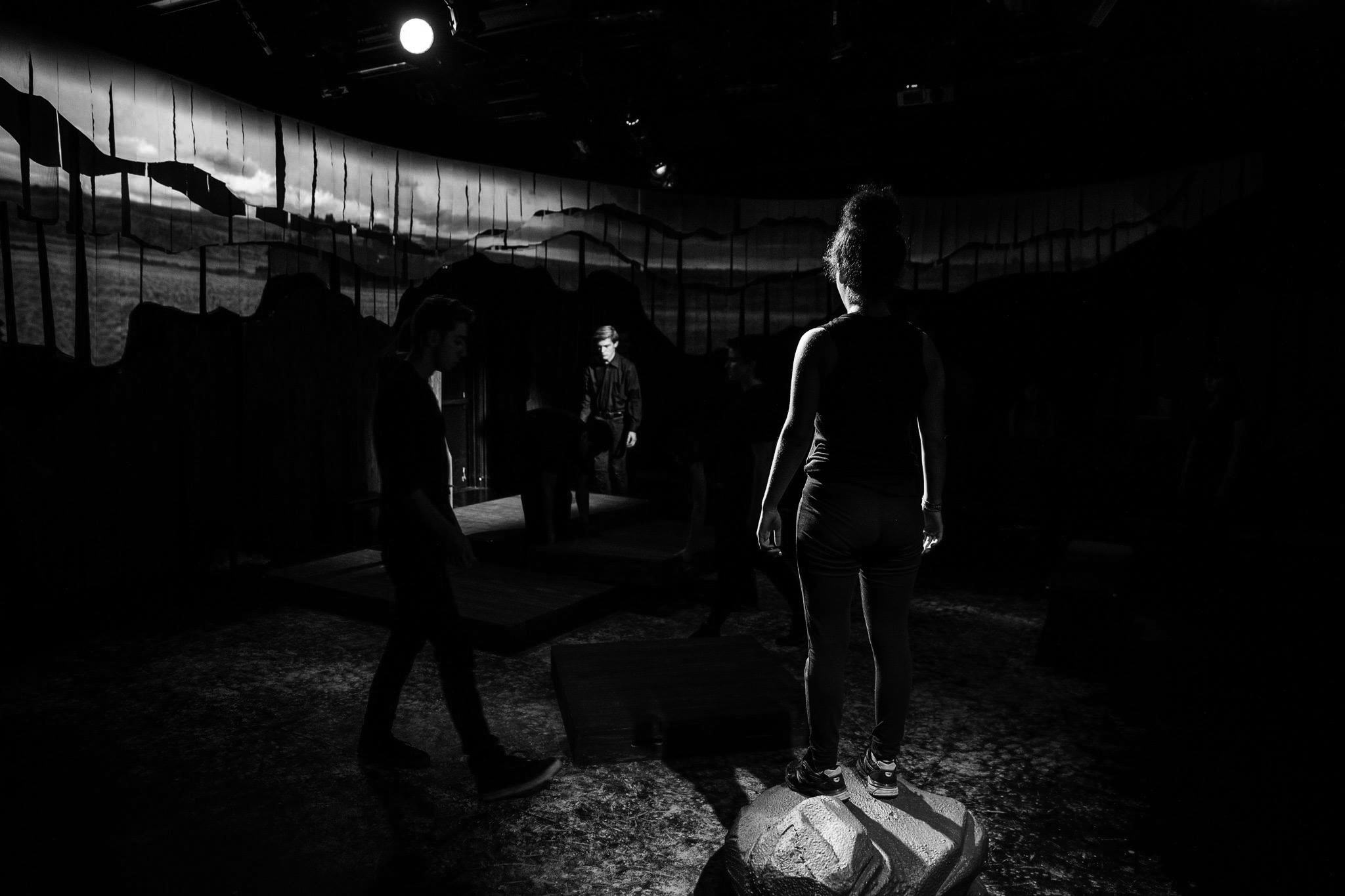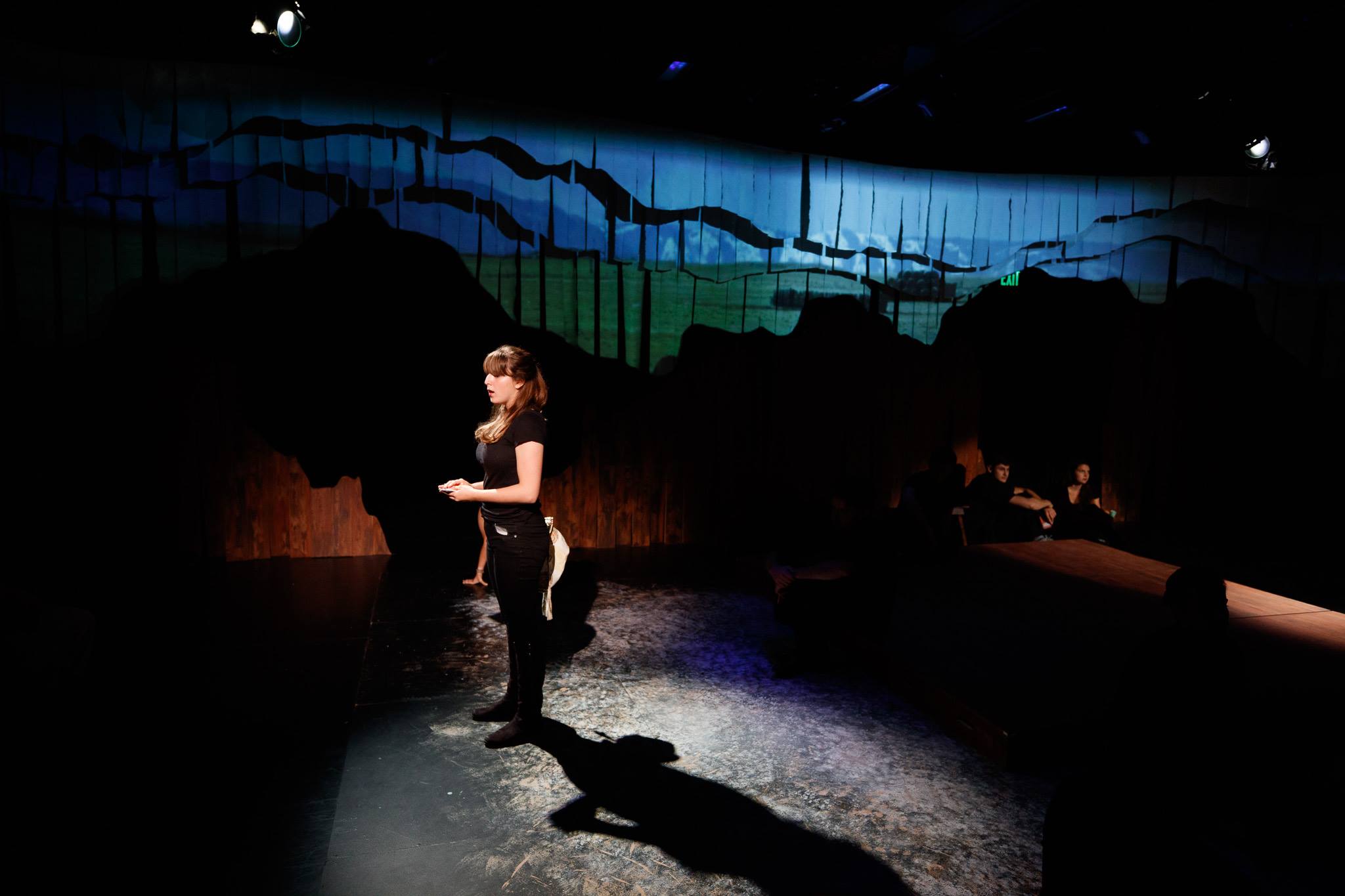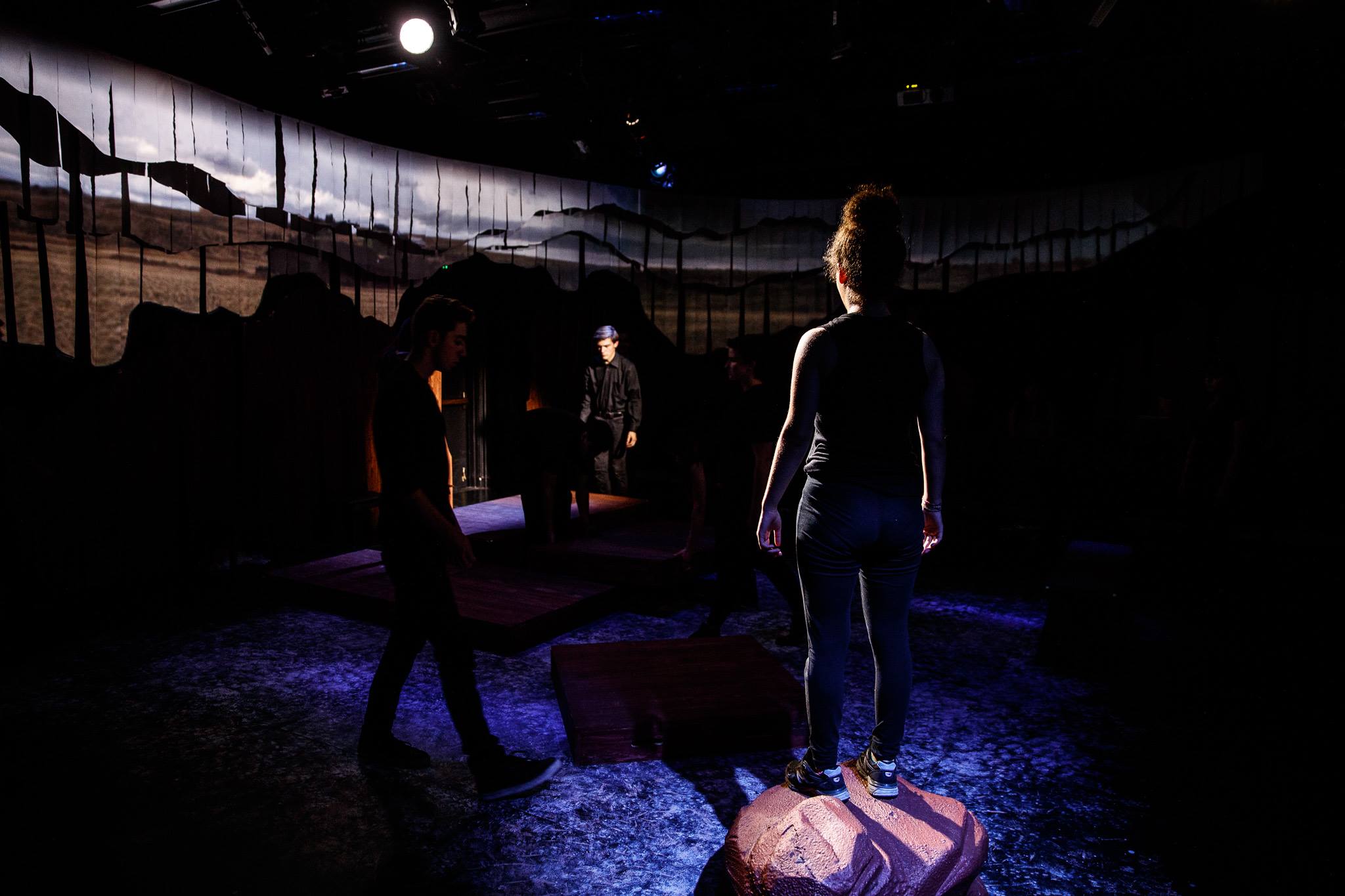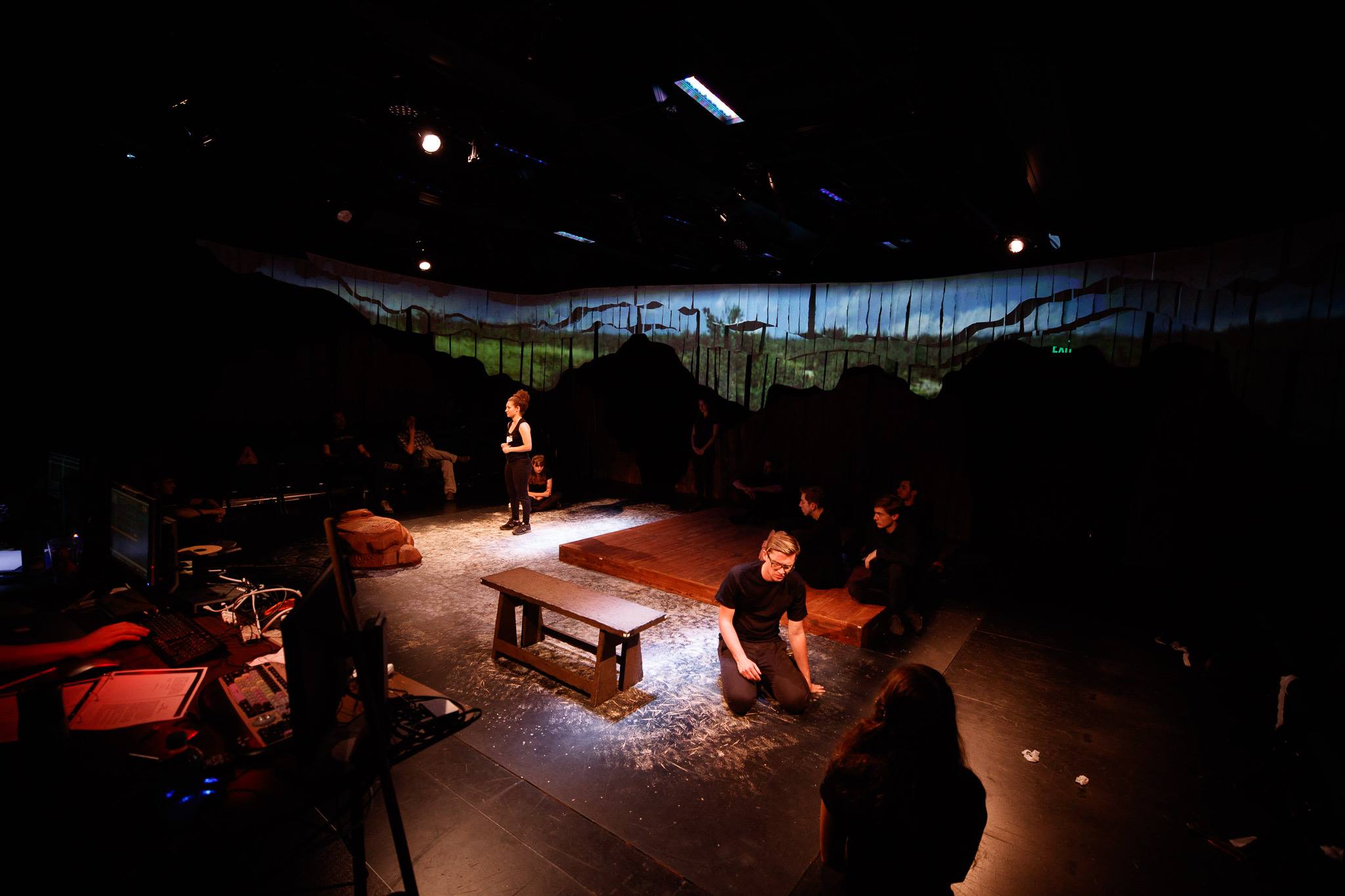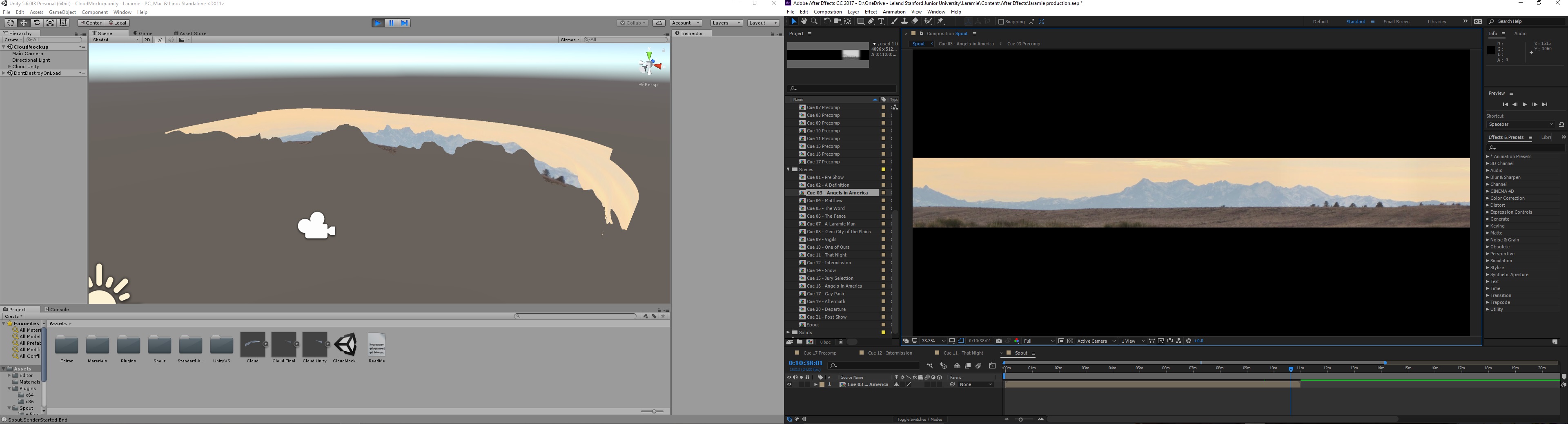 The Laramie Project was a senior capstone in the Theatre and Performance Studies Department at Stanford University. Staged in 3/4, the video content wrapped above the heads of the audience as a "cloud" that featured imagery from the show's setting of Laramie, Wyoming. Content was streamed from Figure 53's Qlab to Derivative's Touch Designer, which handled the 3d multi projector mapping for the cloud's complex shape.