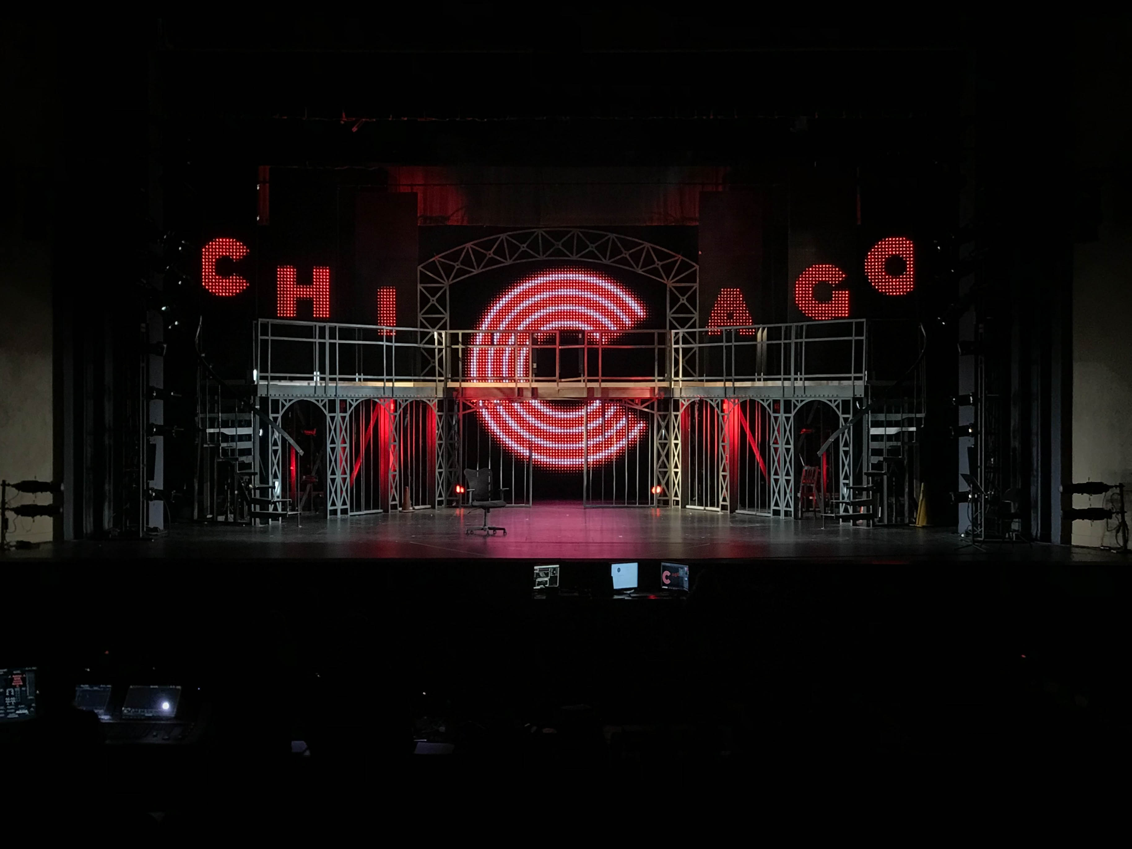Chicago was produced by Ram's Head Theatrical Society and staged in Stanford's Memorial Auditorium. Featuring a custom built video wall, the video design for Chicago was inspired by the rich visual history of Vaudville. Content was distributed through a combination of in-house software and Dataton's Watchout.