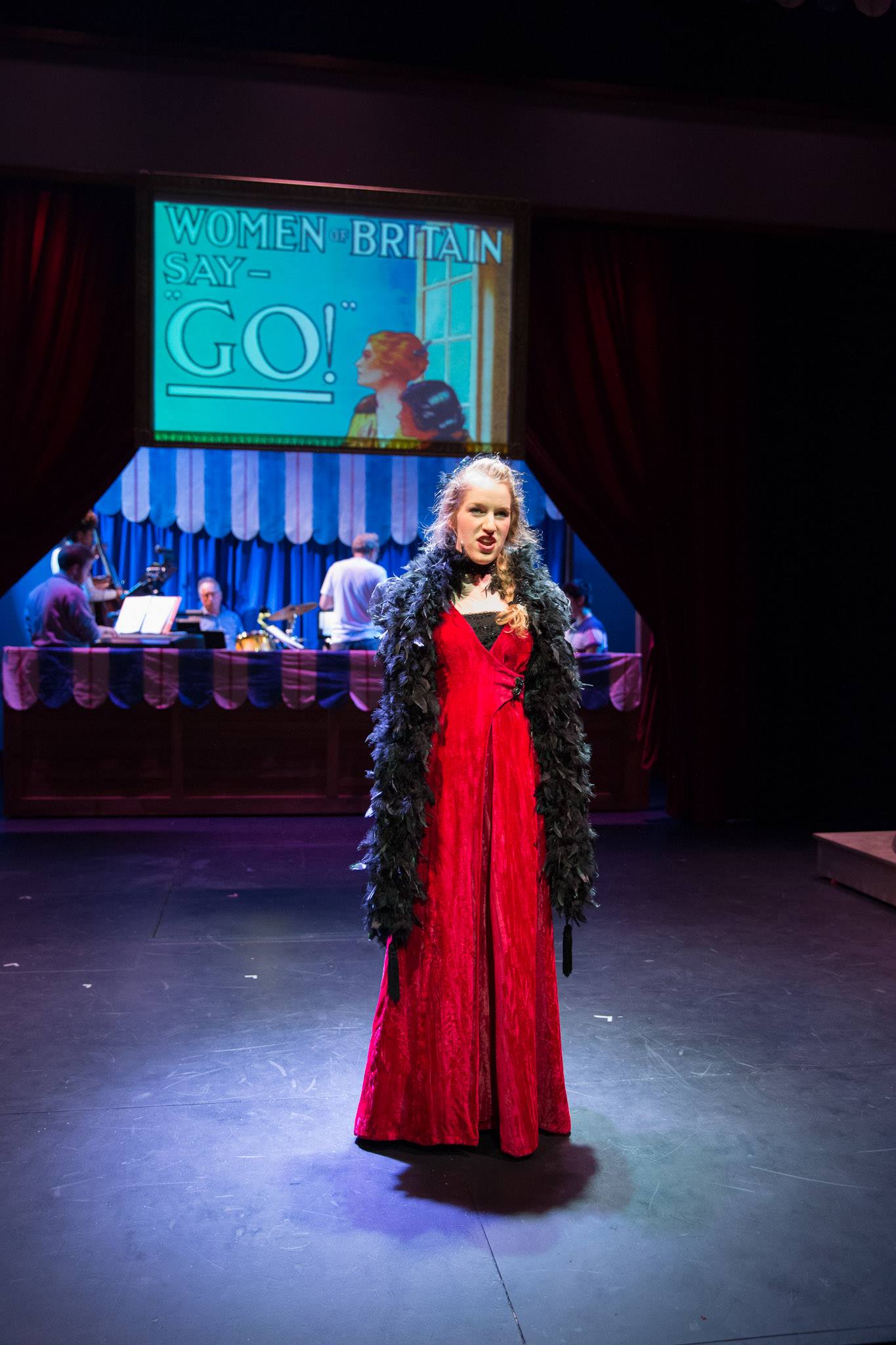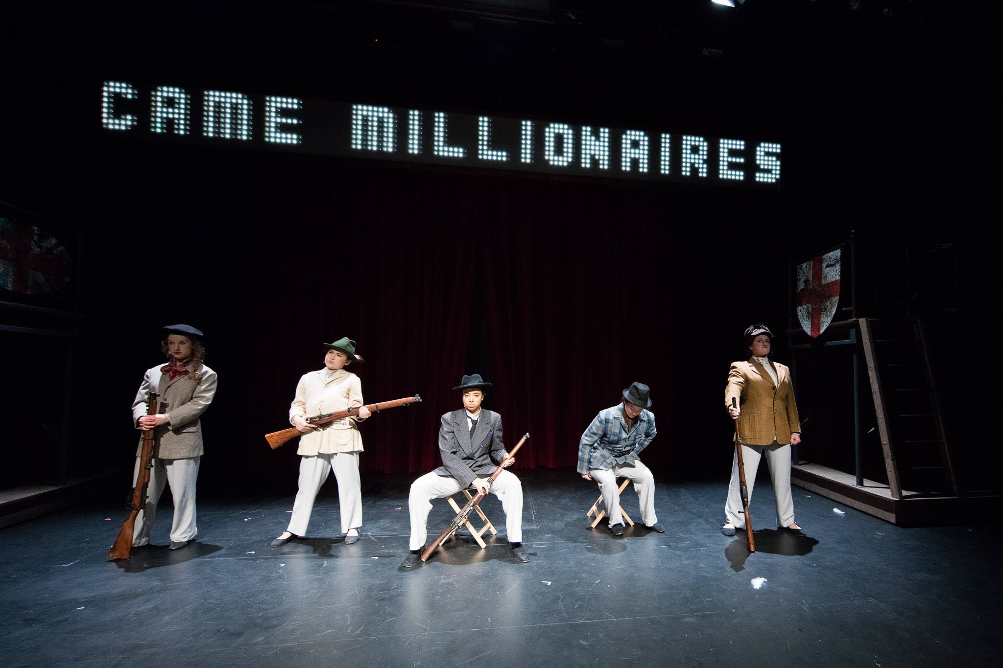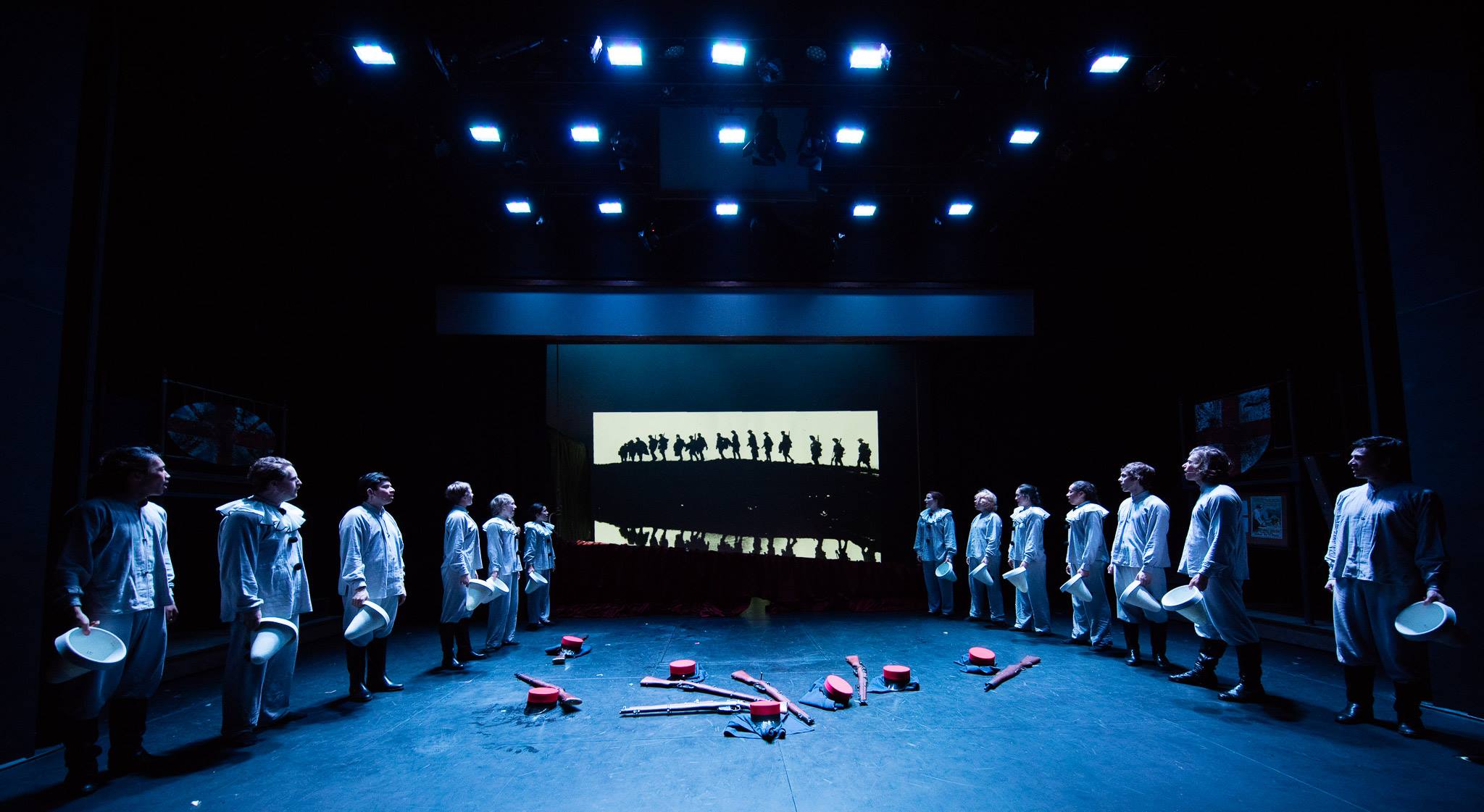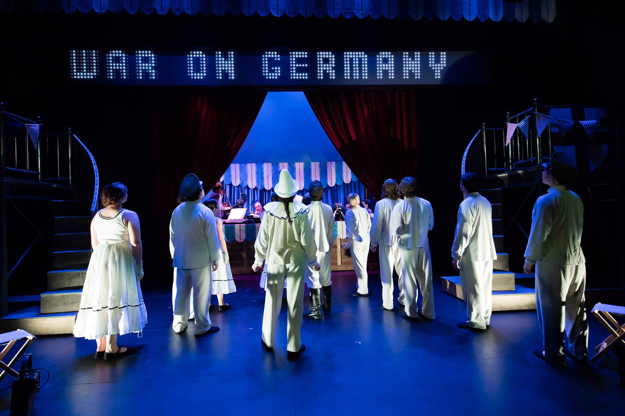Oh! What a Lovely War was produced by the Department of Theatre and Performance studies in Stanford's Pigott Theatre. Multimedia content for the show featured slide shows of maps and propaganda, a scrolling readerboard of newspaper headlines, and historical images projected on the rear backdrop. All content was driven by Figure 53's Qlab, and the readerboard was a portion of the Video Wall used in Hairspray and Chicago.